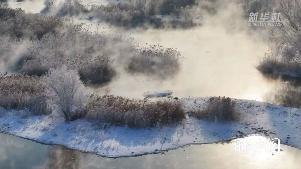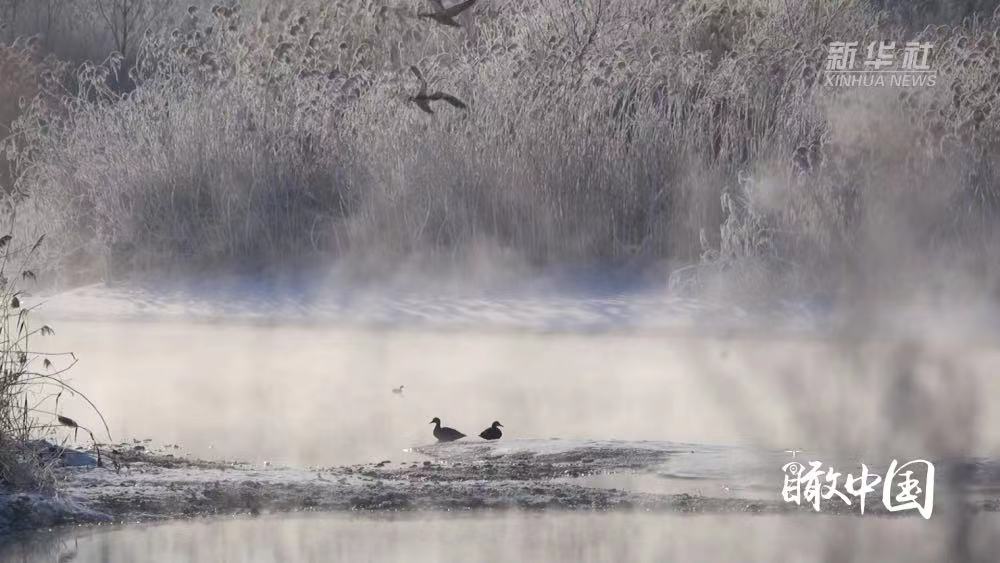 近日,河北迁安迎来大幅降温,清晨的滦河迁安段湿地呈现出独特的雾凇景观。晶莹剔透的树挂,水汽蒸腾的河面,越冬的野鸭,交相辉映,整片湿地如诗如画,勾勒出一幅自然和谐的山水画卷。