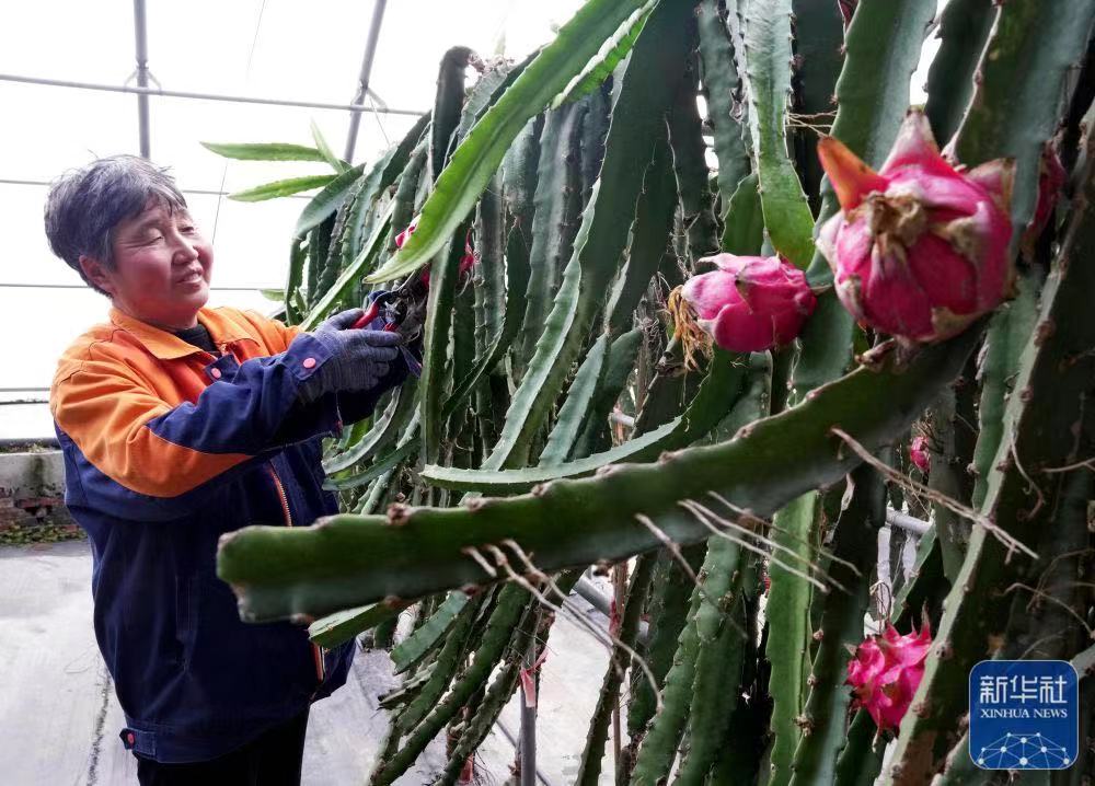 ↑12月26日,河北省滦州市九百户镇一家生态农业园的工人在管护火龙果。