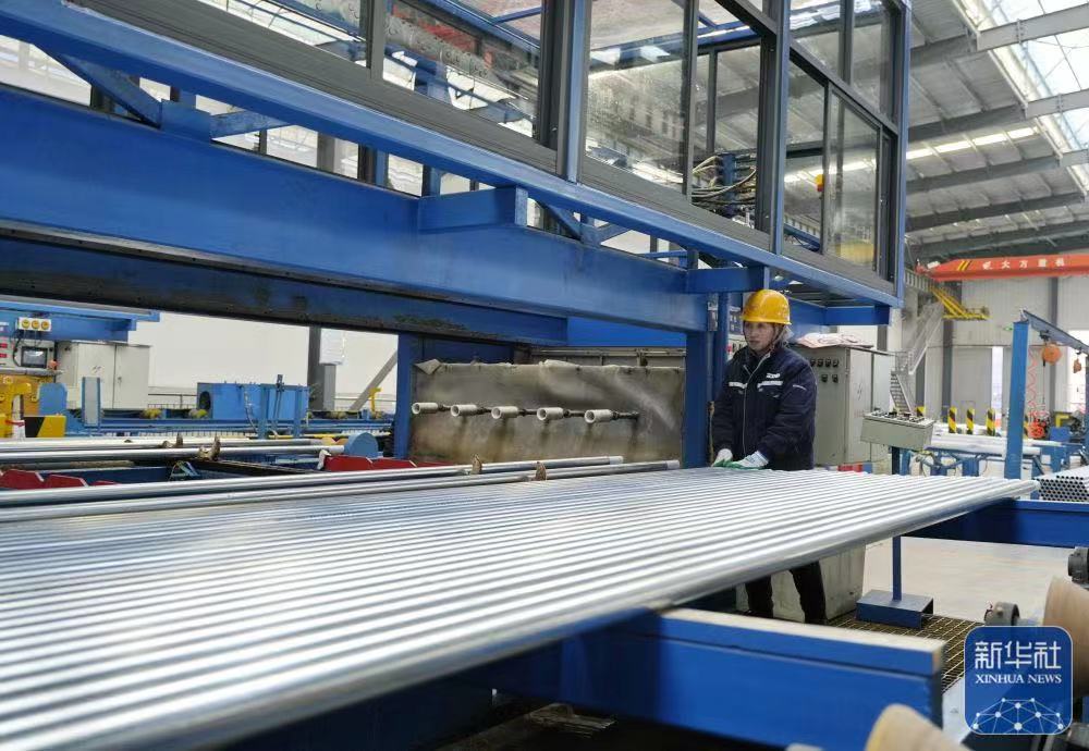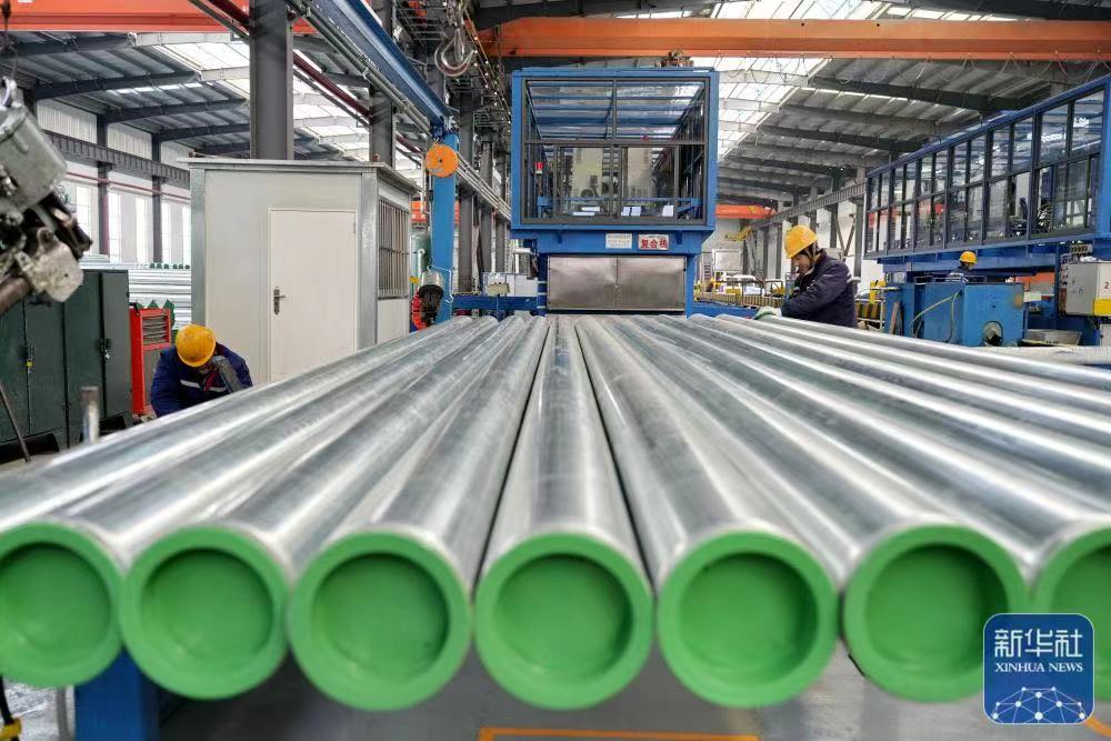 ↑12月28日,河北省迁安市一家钢管出口企业的工人在生产线上工作。