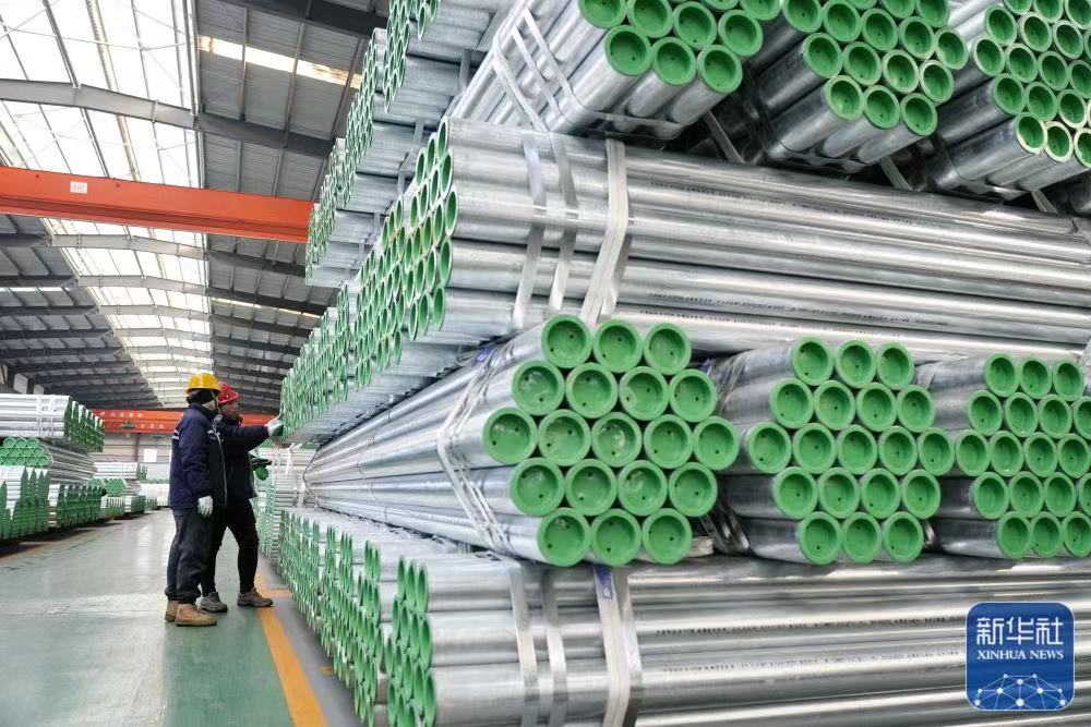 ↑12月28日,河北省迁安市一家钢管出口企业的工人在车间内核对产品信息。