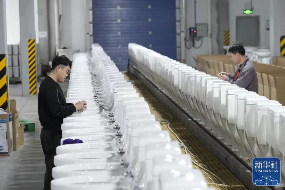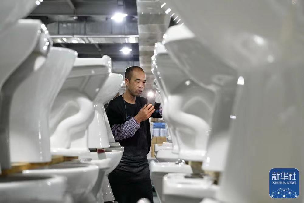 ↑12月28日,河北省迁安市一家卫生陶瓷出口企业的工人在检查陶瓷产品质量。