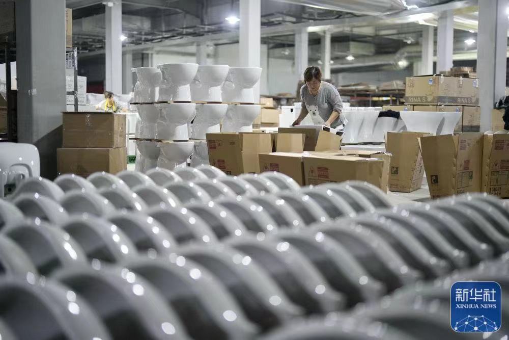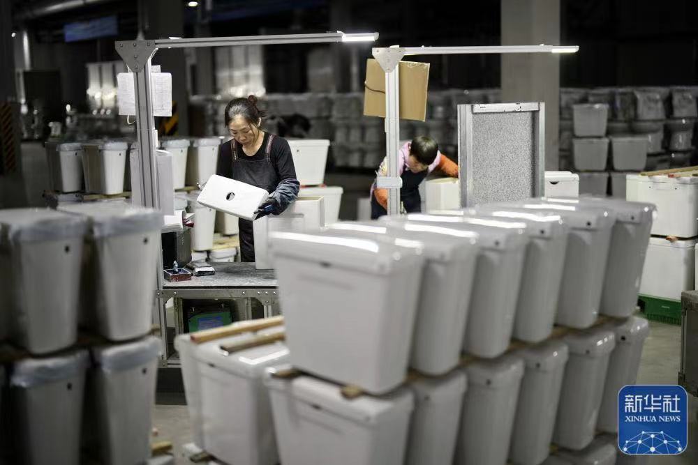 ↑12月28日,河北省迁安市一家卫生陶瓷出口企业的工人在包装产品。