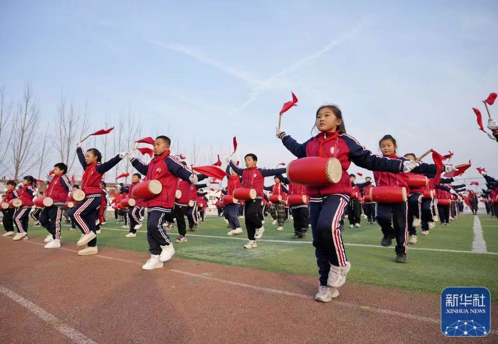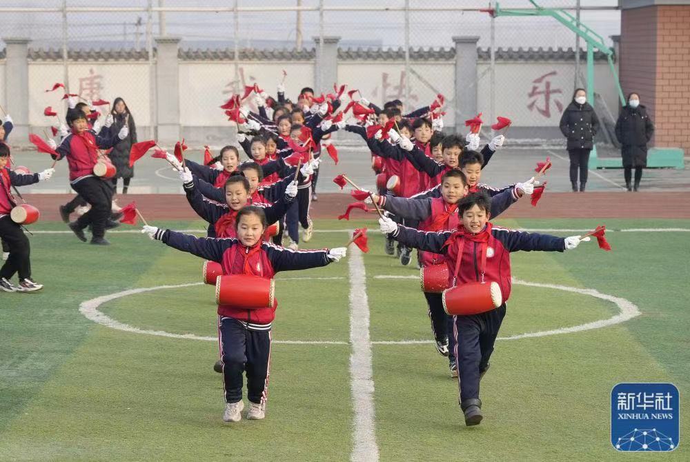 ↑12月29日,河北省滦州市油榨镇于家河小学学生在操场上打腰鼓,迎接新年。