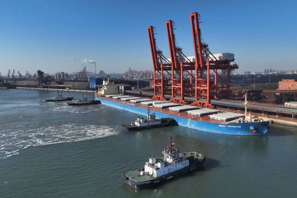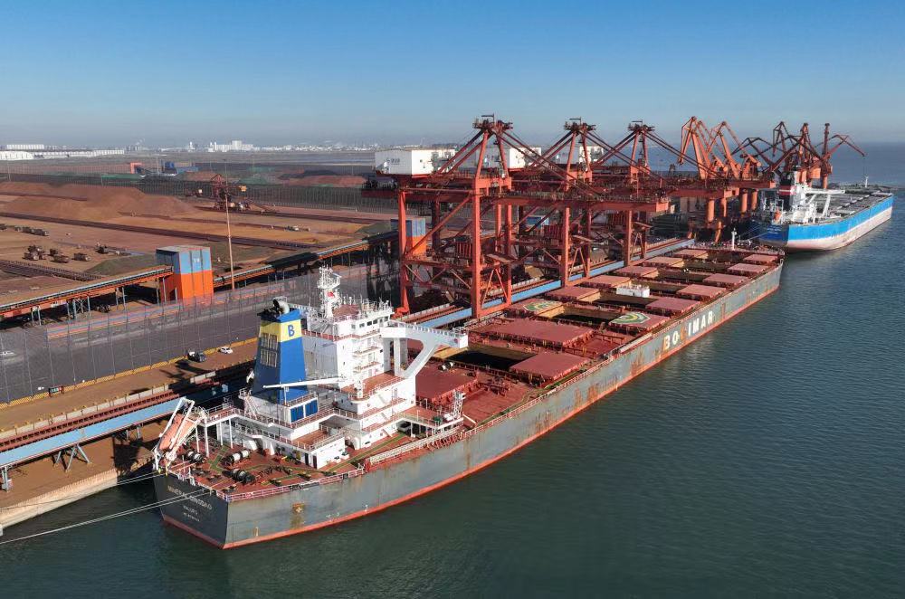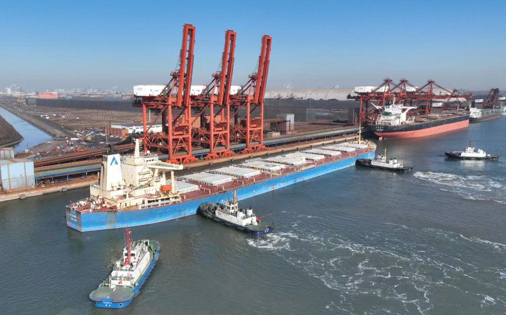 ↑1月15日,两艘轮船靠泊在唐山港京唐港区矿石码头卸载货物(无人机照片)。
