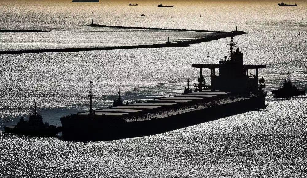 ↑1月15日,一艘轮船在拖轮的协助下向唐山港京唐港区煤炭码头靠泊(无人机照片)。