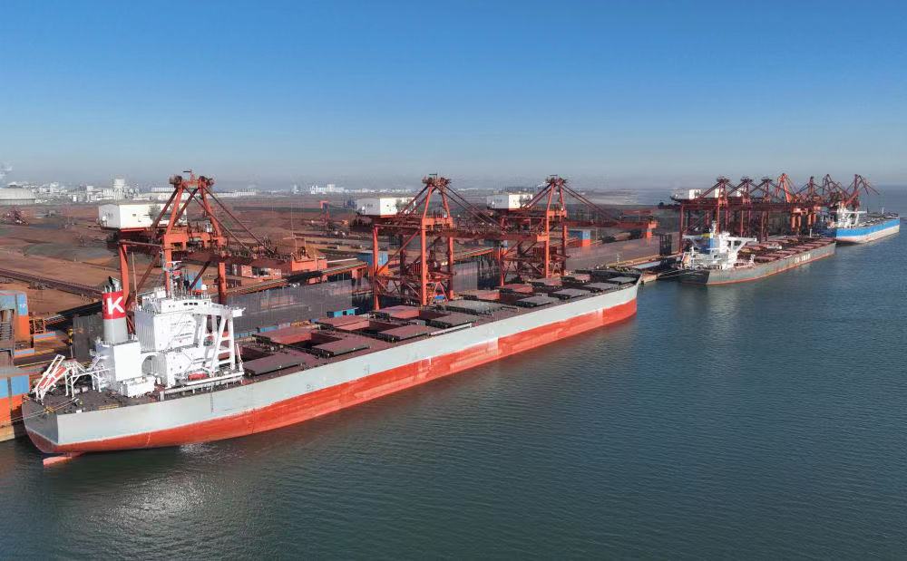 ↑1月15日,三艘轮船靠泊在唐山港京唐港区矿石码头卸载货物(无人机照片)。